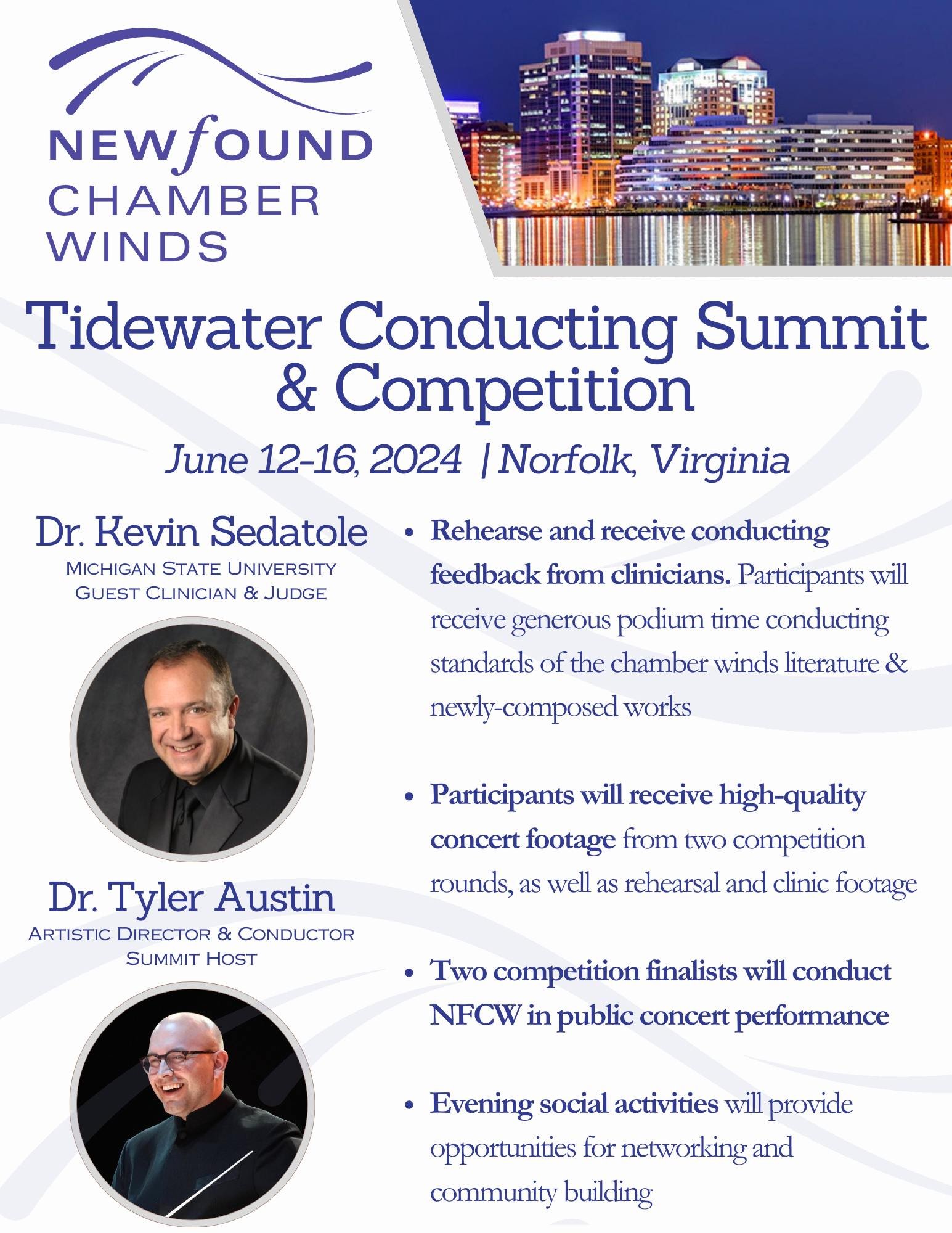 The Tidewater Conducting Summit and Competition is a selective program based in Norfolk, Virginia in which ten invited conductors will rehearse and perform with Newfound Chamber Winds. This yearโs summit participants will be mentored by Dr. Kevin Sedatole, Director of Bands at Michigan State University. The summit will also include professional development sessions led by NFCW members and an acclaimed roster of guest clinicians.